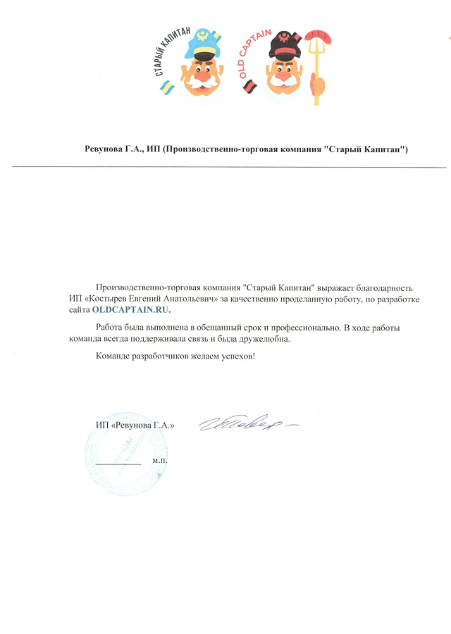 Производственно-торговая компания «Старый Капитан» выражает благодарность ИП «Костырев Евгений Анатольевич» за качественно проделанную работу, по разработке сайта.