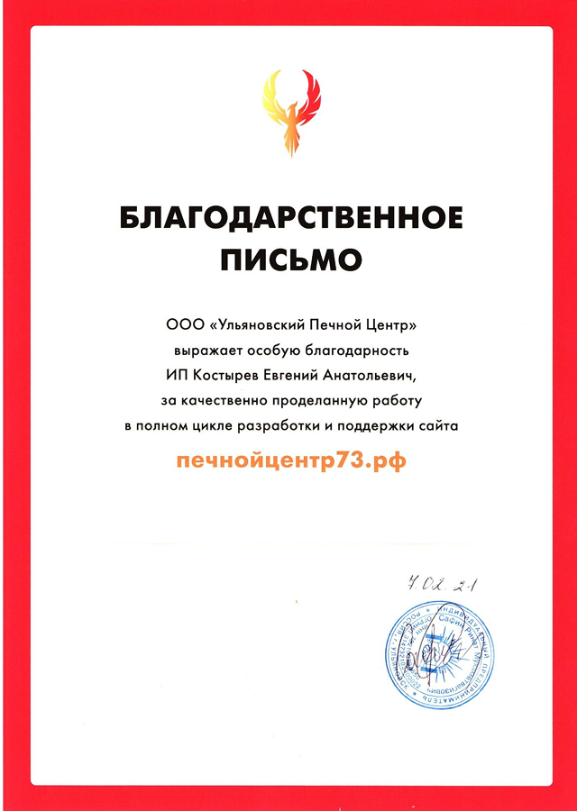 ООО «Ульяновский печной центр» выражает особую благодарность ИП Костырев Евгений Анатольевич, за качественно проделанную работу в полном цикле разработки и поддержки сайта.