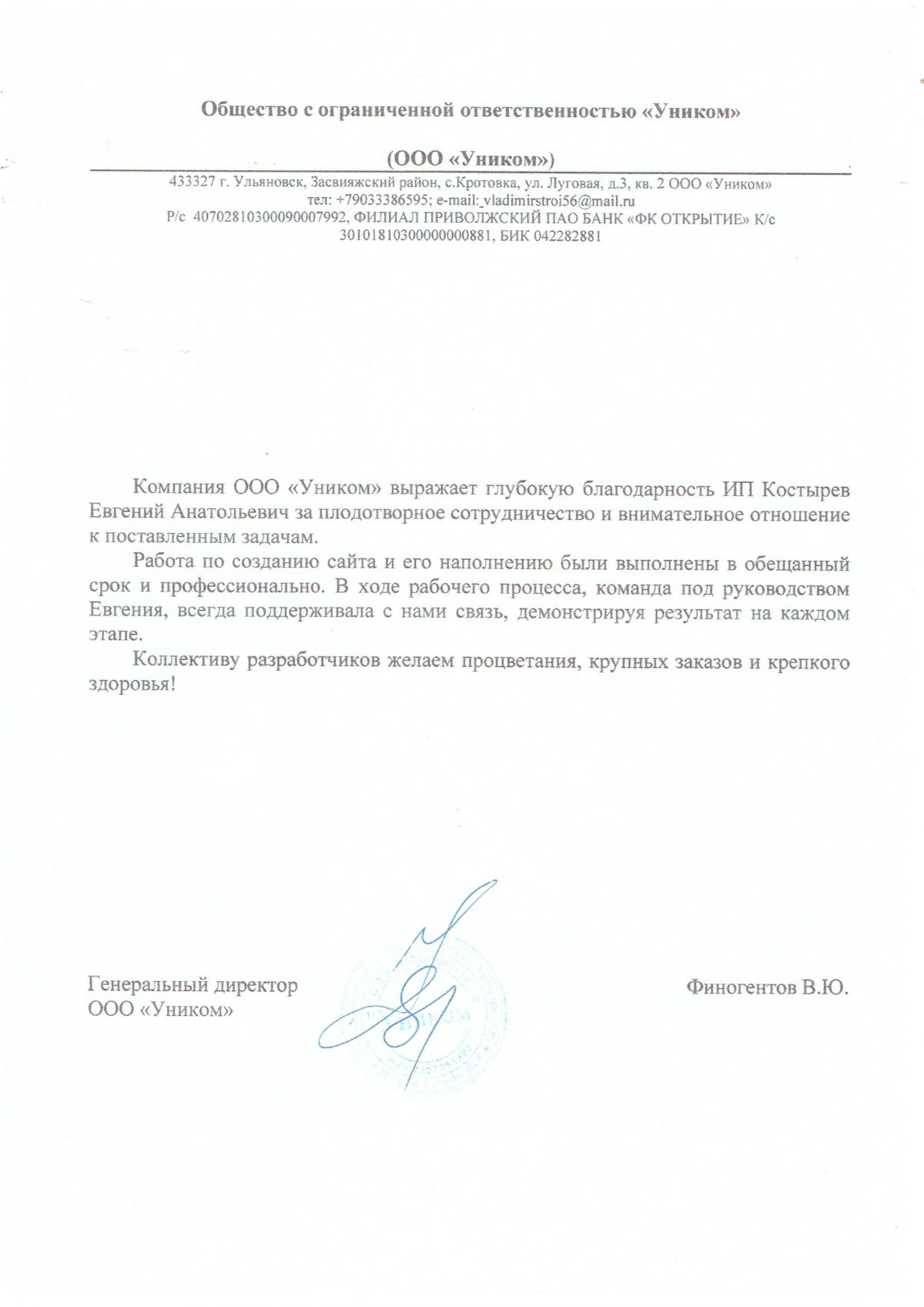 Компания ООО «Уником» выражает глубокую благодарность ИП Костырев Евгений Анатольевич за плодотворное сотрудничество и внимательное отношение к поставленным задачам.