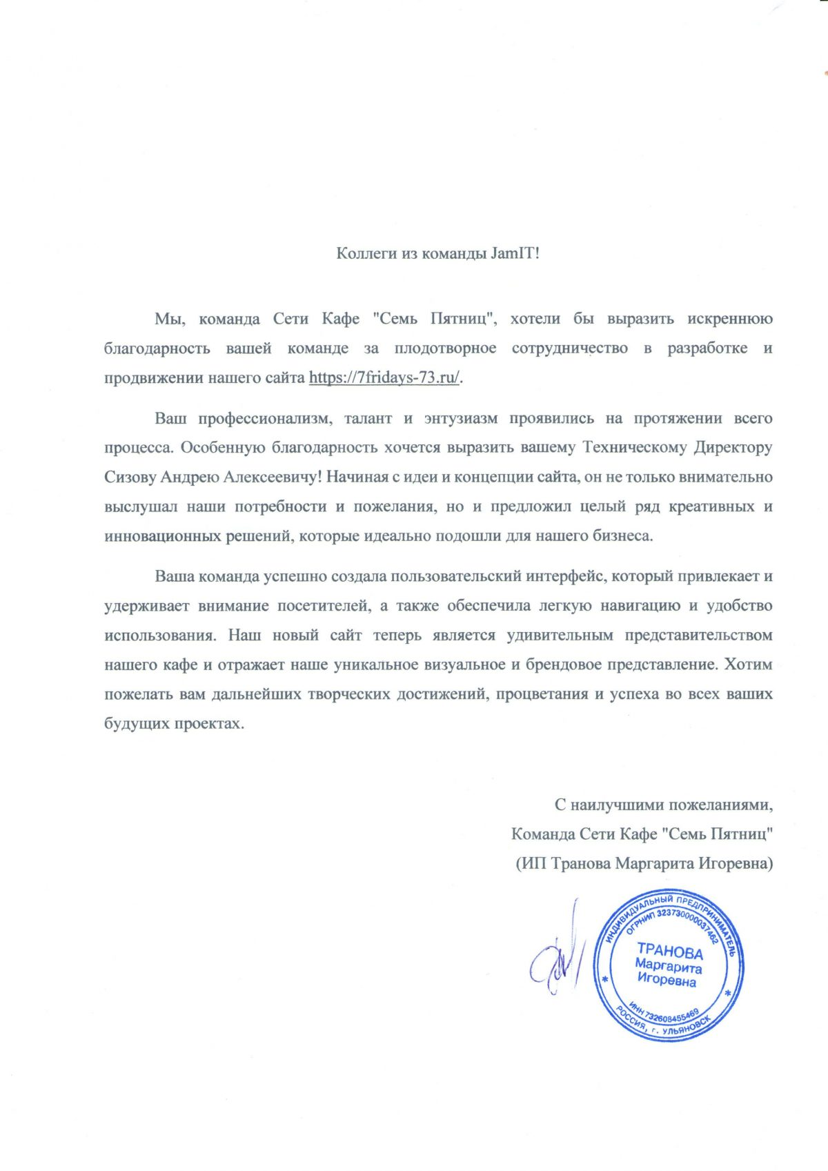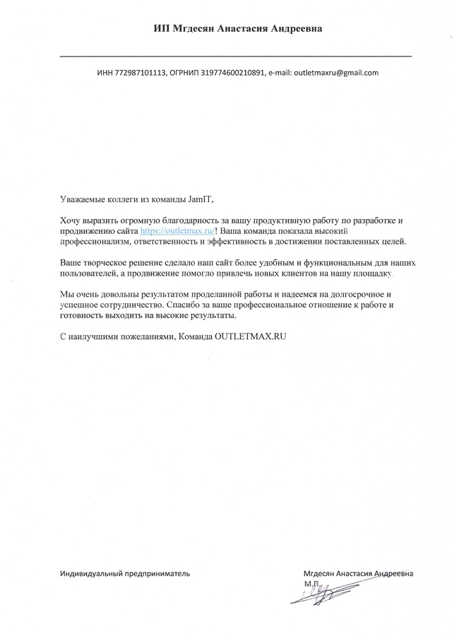 Уважаемые коллеги из команды JamIT, Хочу выразить огромную благодарность за вашу продуктивную работу по разработке и продвижению сайта! Ваша команда показала высокий профессионализм, ответственность и эффективность в достижении поставленных целей.